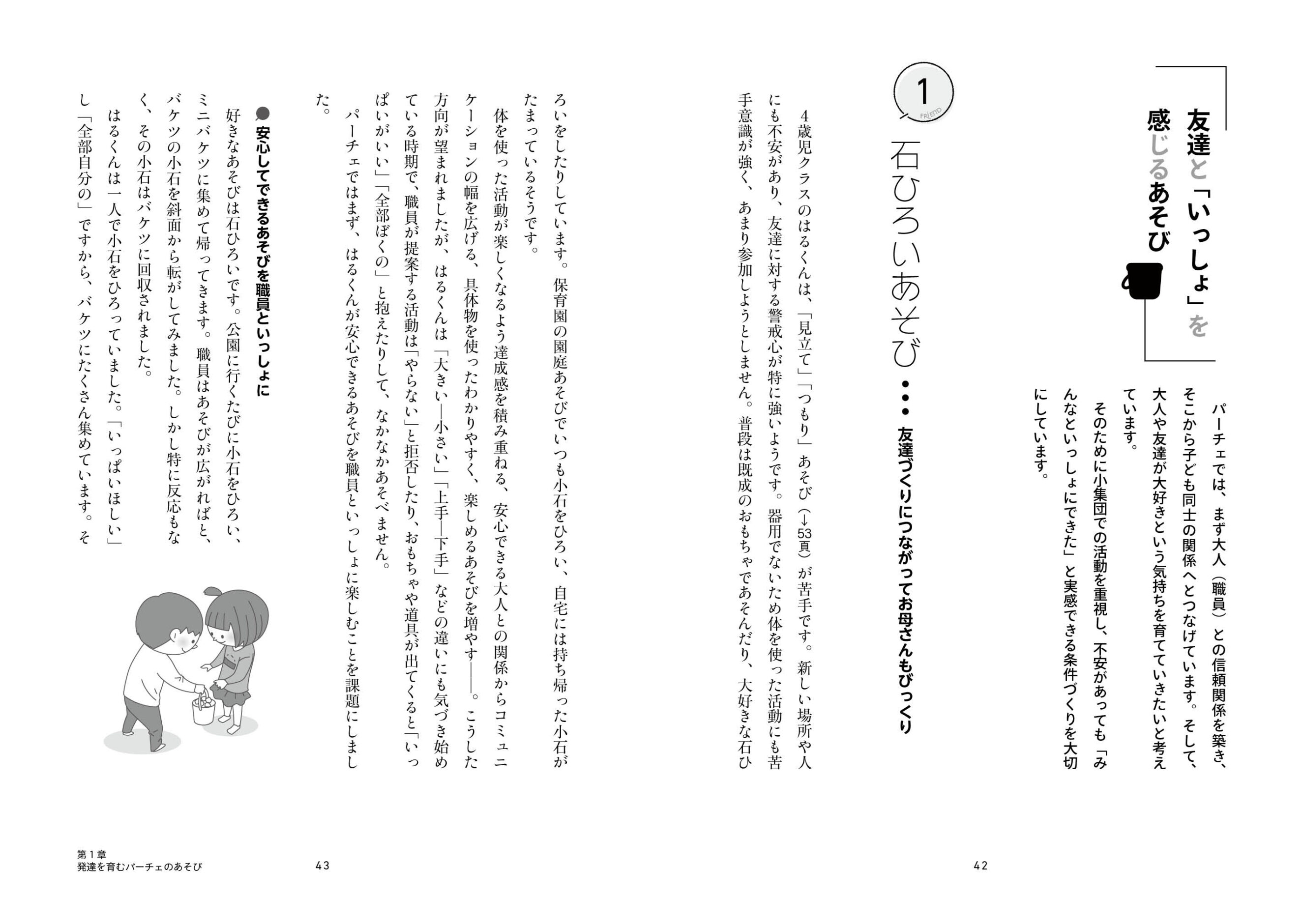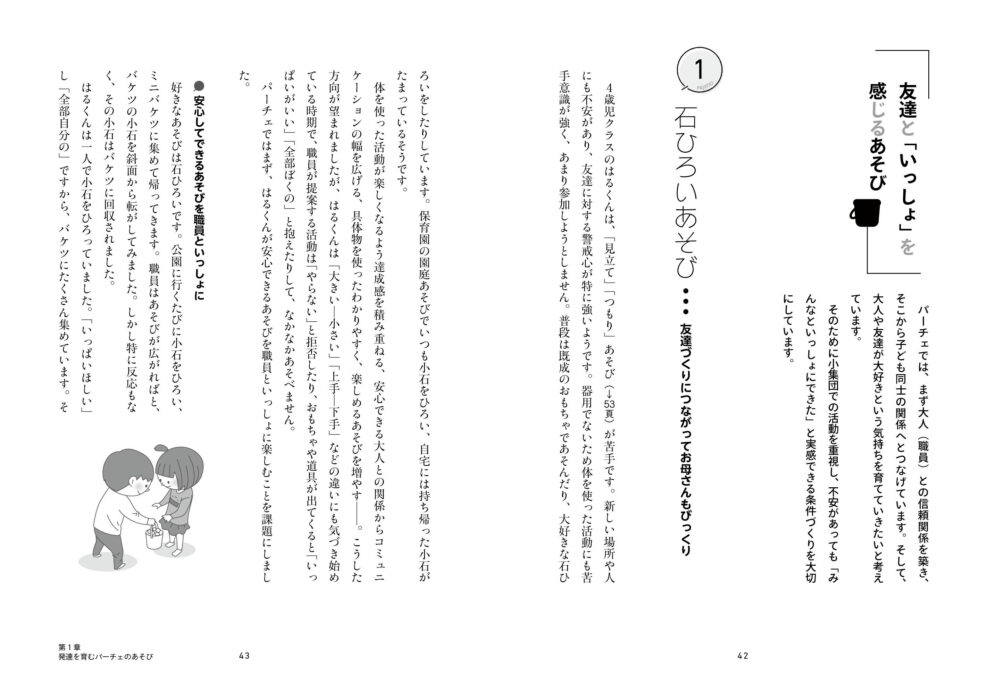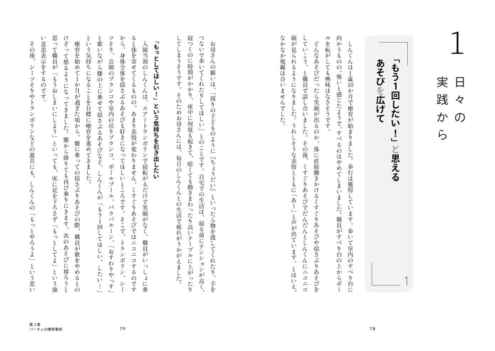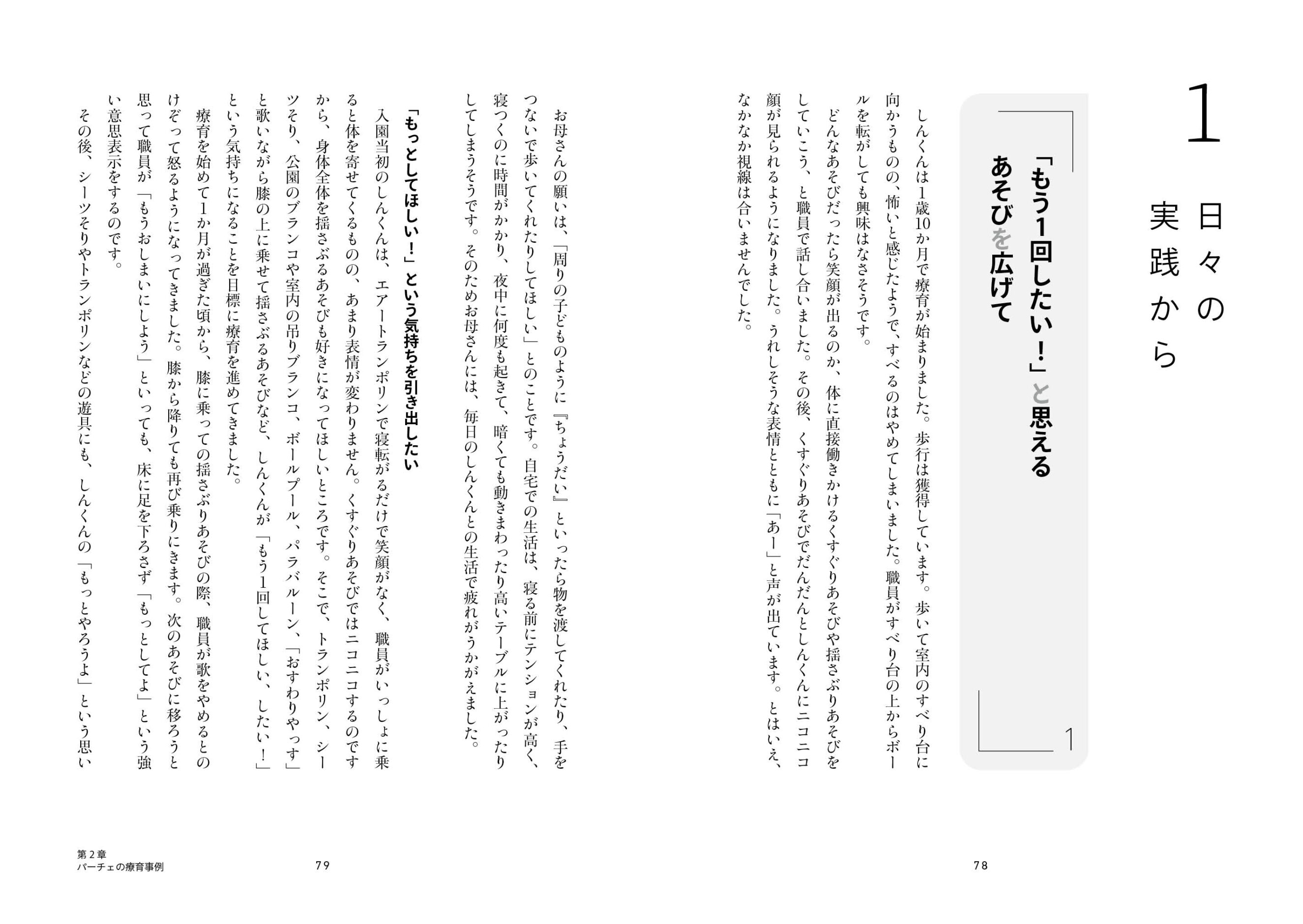 子どもの発達と特性の理解を大切にしたパーチェならではの「あそび」を第1章に、親子支援が具体的な事例を第2章に、変遷する制度をふまえつつ、20年にわたるあゆみを第3章に。