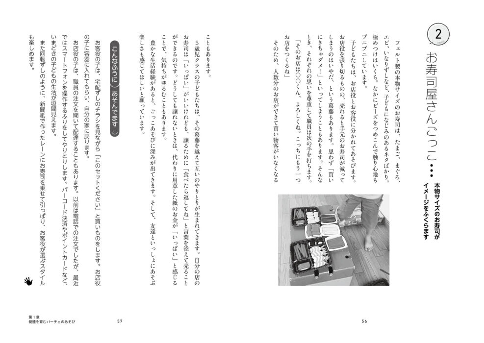 2 子どもたちの願いから出発したあそびと工夫 全身の感覚や協調性を育むあそび ①風呂敷パラバルーン……ふんわりした空気が緊張をときほぐす ②エアートランポリン……いつもはできない大胆な動きを経験 ③ボールプール……感覚過敏な子どもたちの気持ちをやわらかくする ④山道探索……でこぼこ道が姿勢やバランス感覚を刺激 ⑤芯ロケット……支えながら引っぱって離す ⑥風船ラケット……動きを見ながらラケットで打つ ⑦寒天や小麦粉粘土……手指の活動や見立てる力を育む 友達と「いっしょ」を感じるあそび ①石ひろいあそび……友達づくりにつながってお母さんもびっくり ②市バスウォッチング……大人との関係づくりからはじめる ③シーツそり……からだが包み込まれて揺れる ④消防ごっこ……みんなが「自分が消した」と実感できる 「見立て」や「つもり」を育むあそび ①色水あそび……職員の想定を越えた子どものイメージ ②お寿司屋さんごっこ……本物サイズのお寿司がイメージをふくらます ③パン屋さんごっこ……店主とお客、それぞれの役割を意識してあそぶ ルールのある集団あそび ①おにごっこ……安心してルールのあるあそびが楽しめる ②かくれんぼ……ドキドキが不安にならないために ③ネイチャービンゴ……どんぐりや葉っぱなどをみんなで見つける外あそび ④大きな木の物語づくり……「戦いごっこ」から共同作品づくりへ
