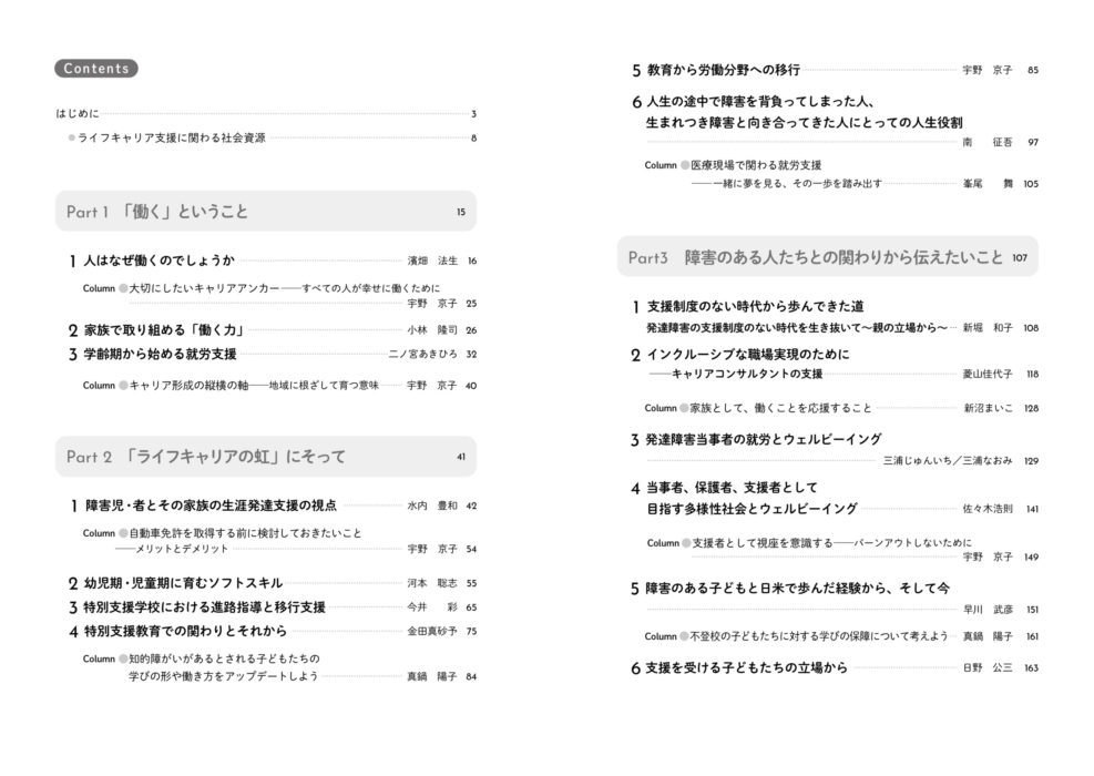 「見通し」をもって、ライフキャリアを描けるように、ジョブコーチやキャリアカウンセラー、研究者や教員、作業療法士、保護者・当事者などさまざまな立場の執筆陣が、事例や経験、生き方や想いを具体的に記す。