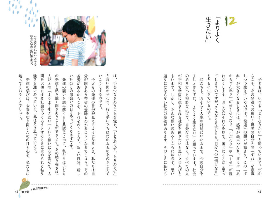 どんなに幼い子どもでも、それぞれの発達時期において、その時期らしい願いをもっています。でも、いつも思い通りにいくとは限りません。泣いて立ち上がり葛藤を繰り返すなかで、あるとき「願い」に近い自分になっていることに気がつきます。