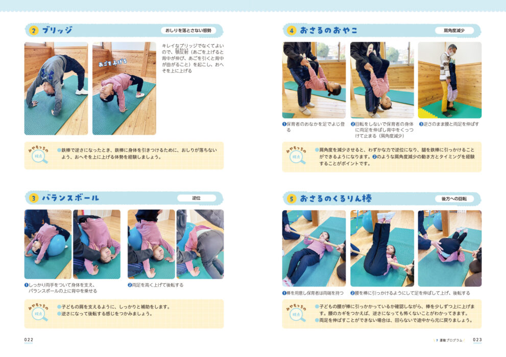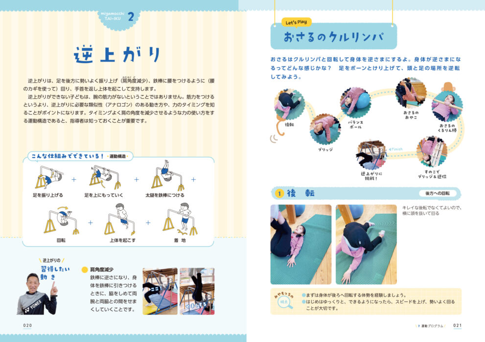 たとえば、逆上がりを教材として考えてみると、みんなに同じような指導方法を説明しても、なかなかできない子どもがいます。 それは、なぜ? 子どもは「ぼくができるようになるコツを教えてほしい」そう願っているのではないでしょうか。 そのためには、一人ひとりがこれまで行ってきた運動経験にあった「オーダーメイドのコツ」が重要です。 ポイントは、 指導者がどんな運動か(運動構造)を知ること、 子どもがやってみたいと思える動機を見つけること。 いつものあそびから、その運動に似ている動きを組み合わせ、子どもの「これならできそう」につなげます。 新たに身につけようとする運動課題と、今もっている力で楽しめるあそびを融合し、 ストーリー性をもたせた「みやもっち体育プログラム」。 ちょっと苦手な運動を“やってみようかな”に変えるヒントがいっぱい。 保育士さん、OTさん、PTさん、親ごさんにもおすすめです。 みんなで楽しく身体を動かそう!