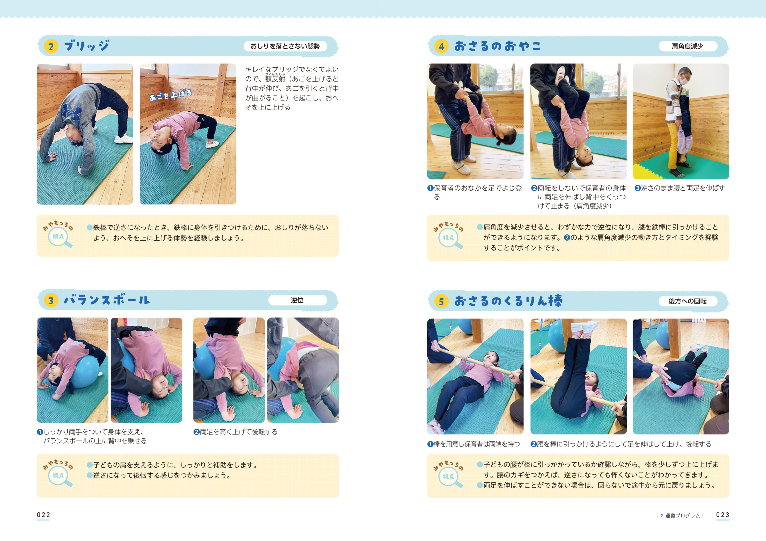 1 前回りおり:ワクワクモンキーパーク 2 逆上がり:おさるのクルリンパ 3 マット運動(前転):人間に進化しよう 4 跳び箱あそび:動物森の冒険 5 長なわ跳び:海賊の島で波あそび 6 短なわ跳び:忍者しゅりけん丸参上 7 プール:進めはらぺこクジラ 8 マストのぼり:ジャックと豆の木の冒険 9 竹馬:竹馬魔法使い 10 ボールあそび:モンスターボール宅急便 11 投運動:モンスターをやっつけろ 12 キッズテニス:きみもエースだ!