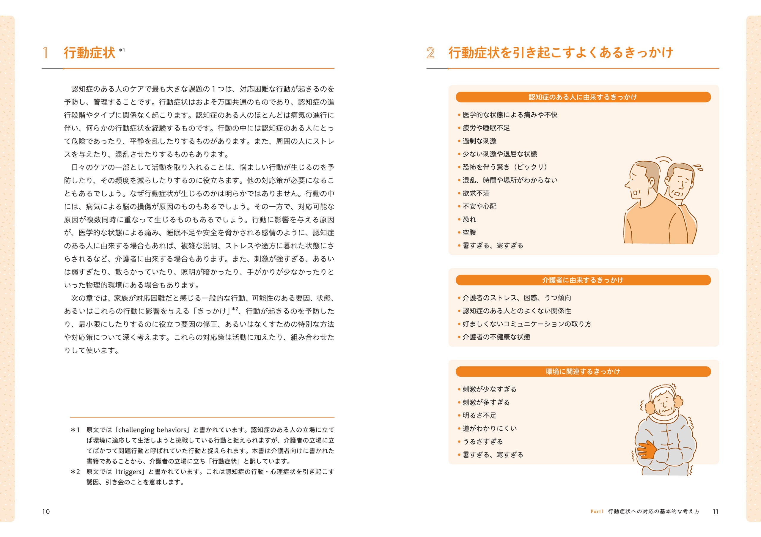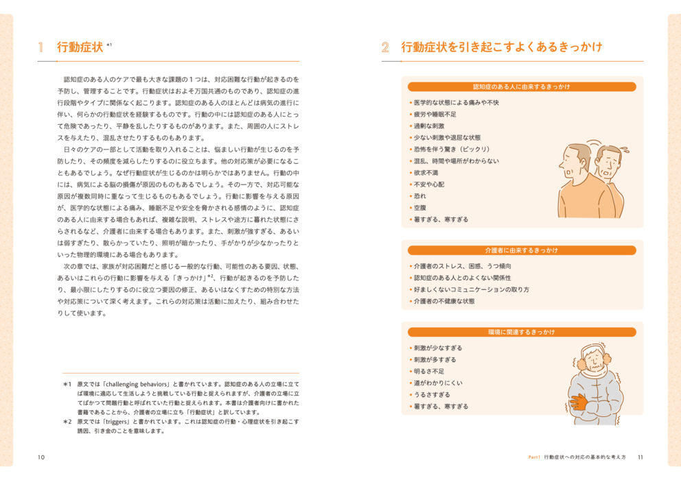 認知症がどの進行程度であっても、よりよく生きることを促進するために、コミュニケーションをとる、アクティビティを使用する、日々の活動を簡略化する、環境を調整する……研究や実践からわかった知識や技能をふんだんに盛り込む。