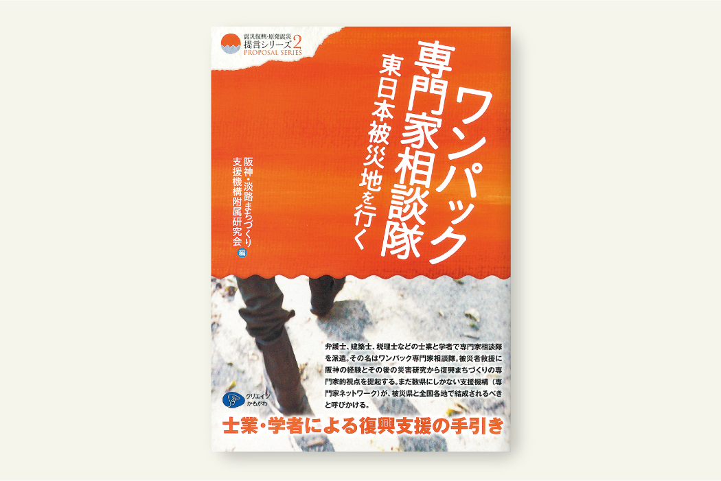 弁護士、建築士、税理士などの士業と学者で専門家相談隊を派遣。その名はワンパック専門家相談隊。被災者救援に阪神の経験とその後の災害研究から復興まちづくりの専門家的視点を提起する。士業・学者による復興支援の手引き。
