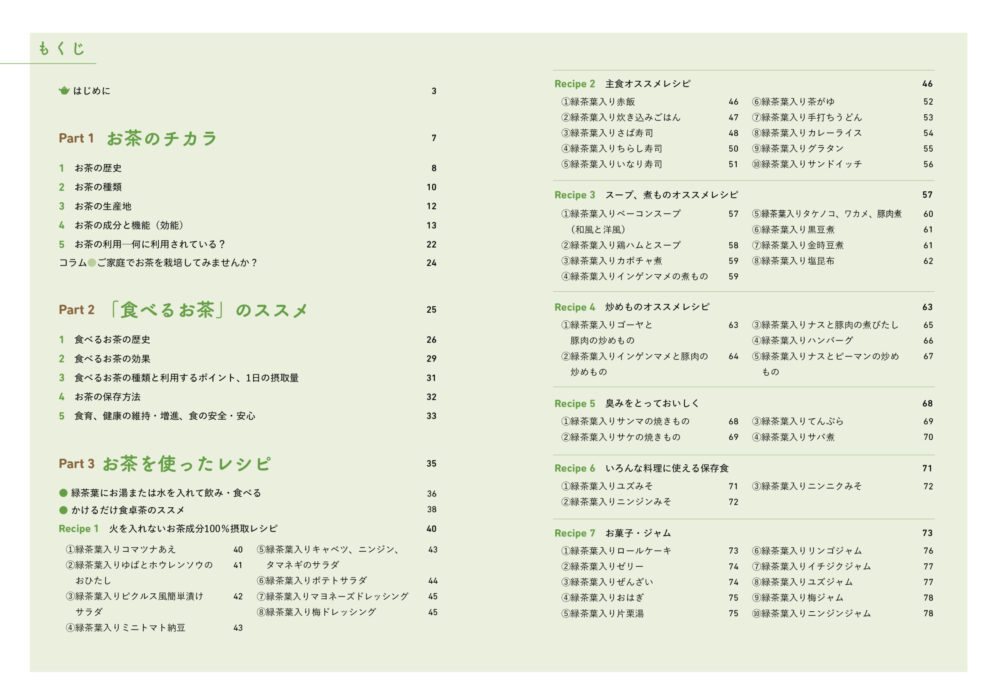 お茶を飲むだけでなく、食べるための「お茶を使ったレシピ」「食べるお茶の効果(お漬物)レシピ」が73例。手軽においしく健康の維持・増進につなげよう。高齢者に、親子での食育にオススメです。