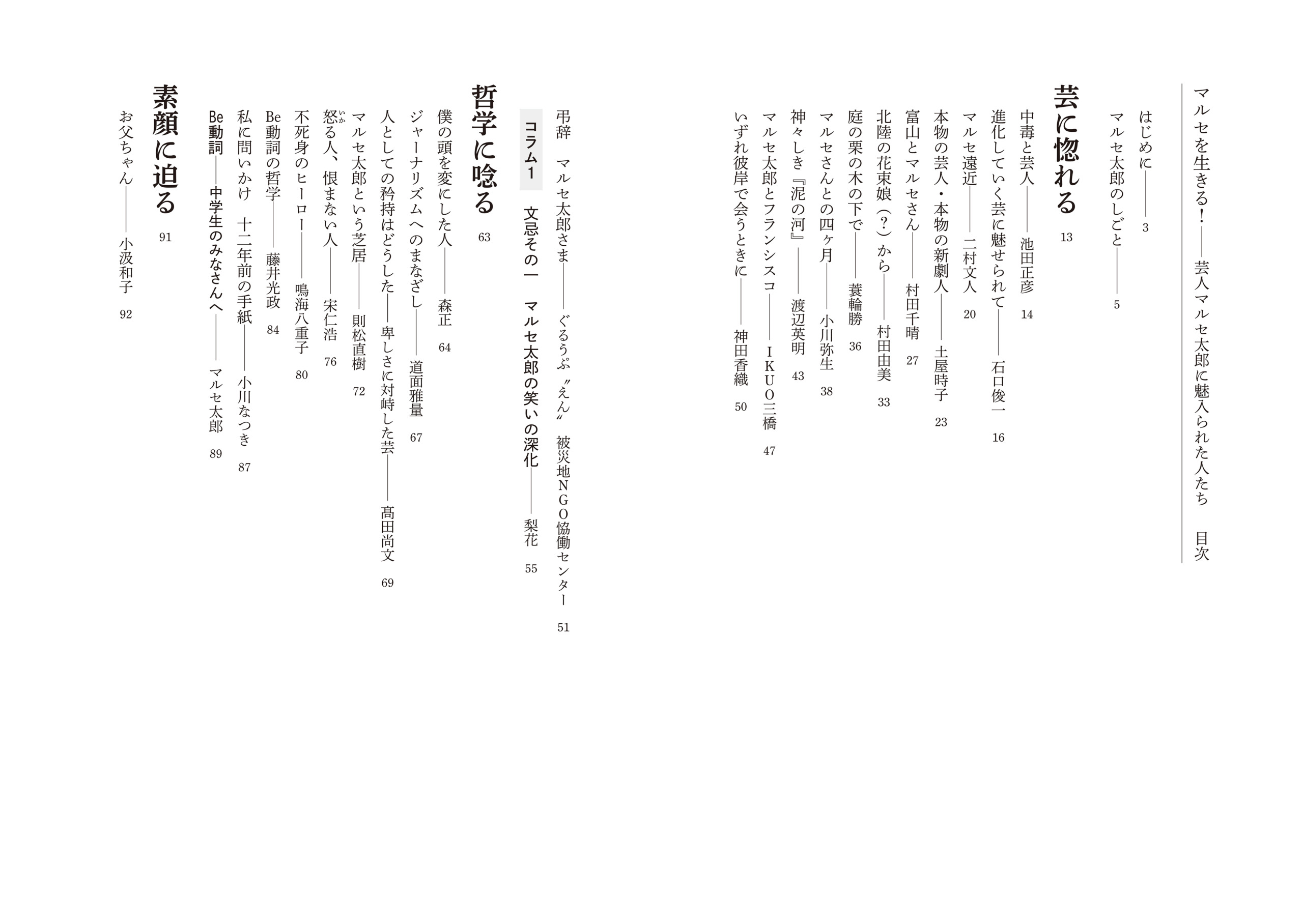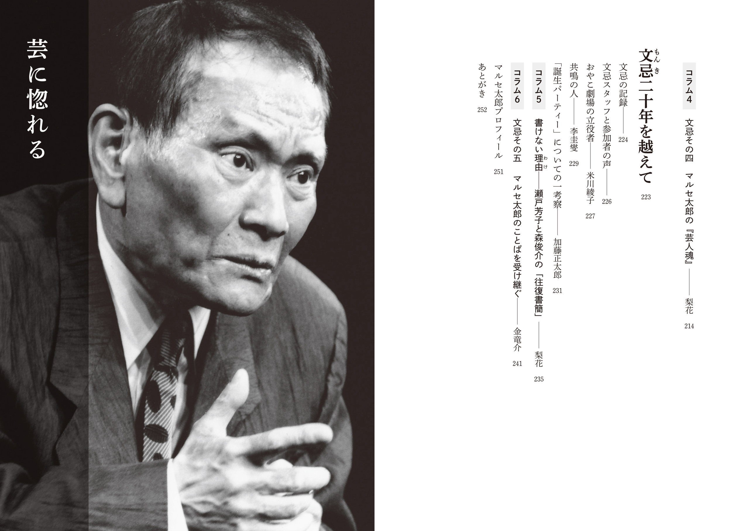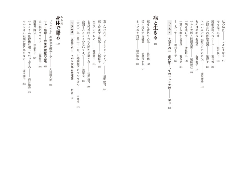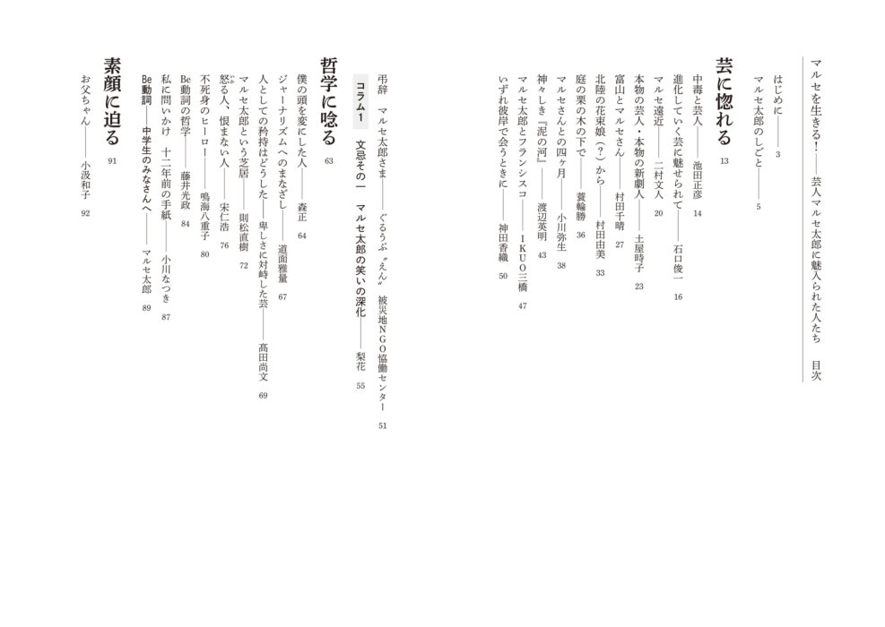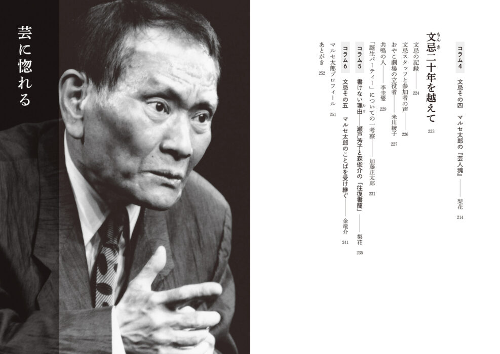 また、娘(梨花)や息子(金竜介)によるマルセ論やこぼれ話に加え、生前講師として笑いや語りの方法について伝授したマルセ語録も掲載。